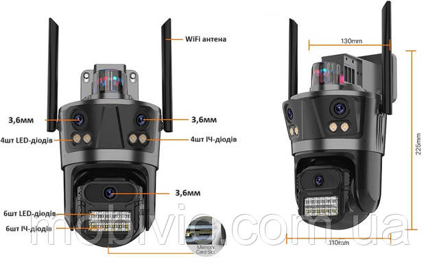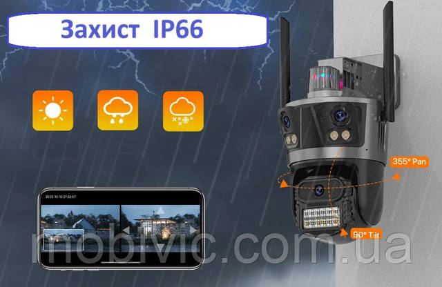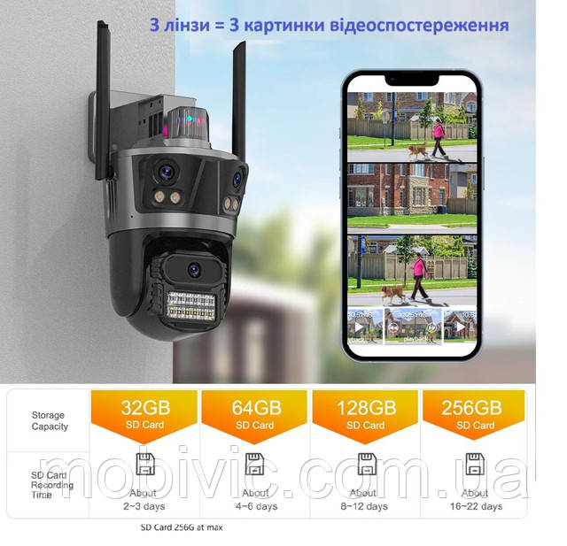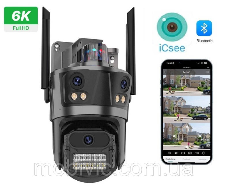| Особливості | Кріплення в комплекті, Датчик руху, Запис звуку, нічна зйомка, Циклічна запис, Сигналізація, WiFi, Запис на хмару, Вологозахищений корпус, Пиловологозахищений корпус, Обертання в 4 сторони, LED-підсвічування, Інтелектуальне стеження, Двостороння аудіозв'язок, 3 об'єктиви, 3 незалежних об'єктива |