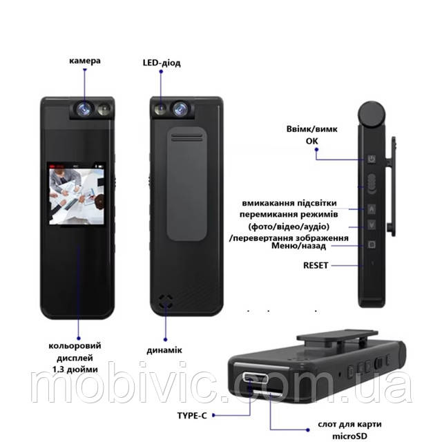 Міні Боді-камера з дисплеєм, LED-підсвіткою, акумулятором 1200 мА·год і зі зручною кліпсою.