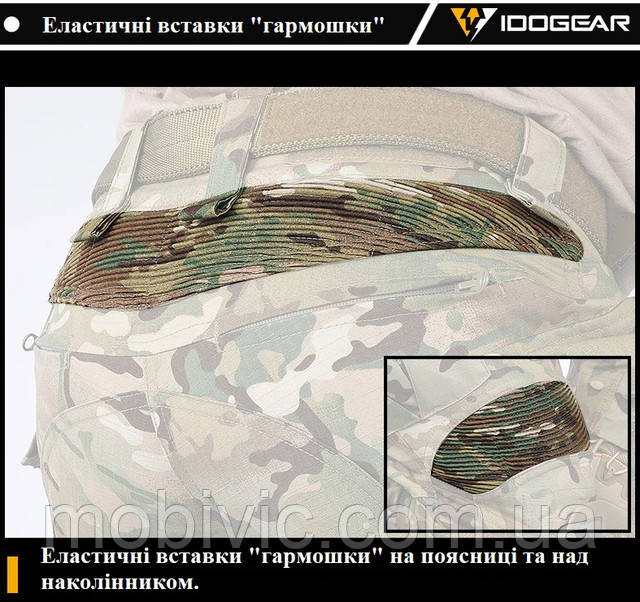 Над наколінниками, на попереку зроблені вставки, такь зібрана гармошка, виконують функції пружини, щоб під час руху штани не стягували та не сковувати, розтягується під час нахилу, присідання, і на коліно